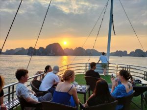 17h30: Come back to Cozy Bay Cruise then take a shower, Relax on sundeck, sunset watching in comfortable lounge chairs while drinking a cocktail or reading a book in the most magical moment.