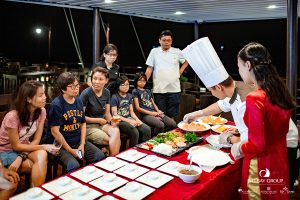 17:30 – 18:30: Join our cooking demonstration and learn how to prepare the famous Vietnamese cuisine, spring rolls. Alternatively, head to the top deck of the cruise to witness the breathtaking sunset over the Gulf of Tonkin. Enjoy a Happy Hour at the bar with a BUY ONE GET ONE FREE offer. This is a perfect moment for photography enthusiasts to capture the mesmerizing sunset over Lan Ha Bay.
