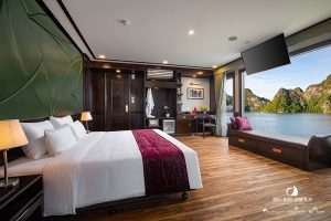 13:00: Indulge in refreshing welcome drinks, accompanied by cool towels, and savor a sumptuous lunch featuring fresh ingredients and delectable delicacies. Dining on our luxury junk is truly an enchanting experience. We then set sail towards Lan Ha Bay, a magnificent member of the World’s Most Beautiful Bays.